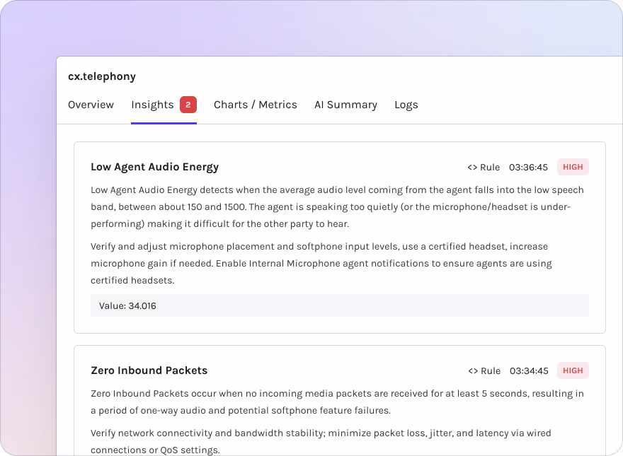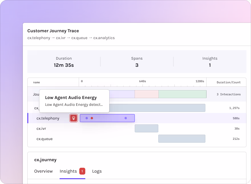 Quickly identify where problems occurred in multi-platform journeys. See exactly when and where a transfer failed, an AI agent handed off, or a call dropped between systems.